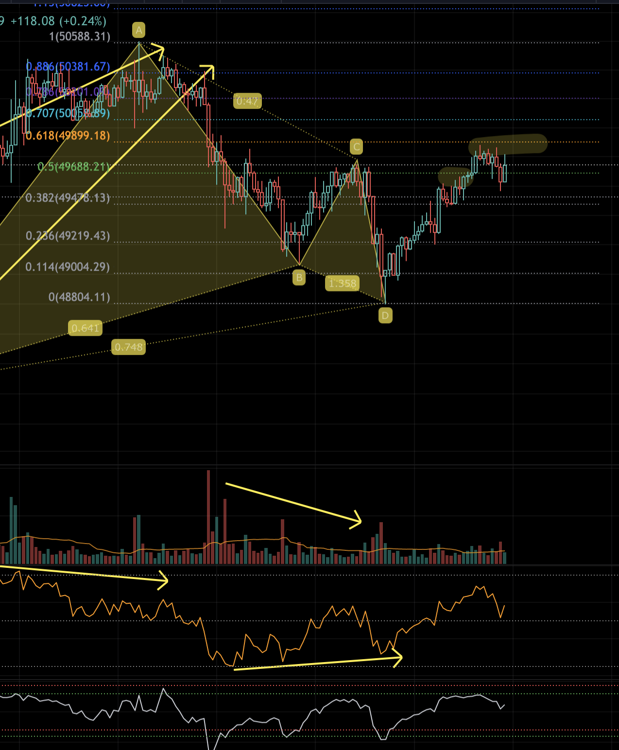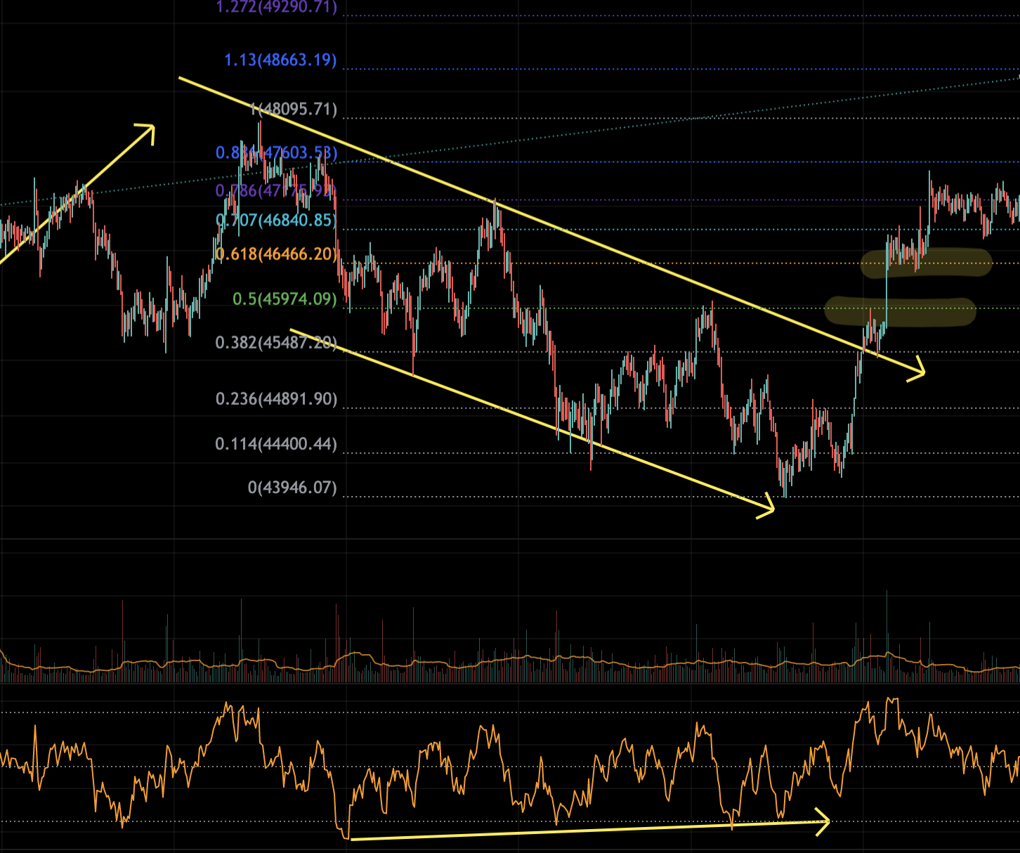 0.5, 0.618에서 지지가 받는 것이 확인되면 불타기 하는 것이 안전함