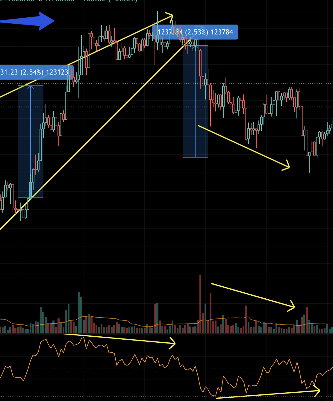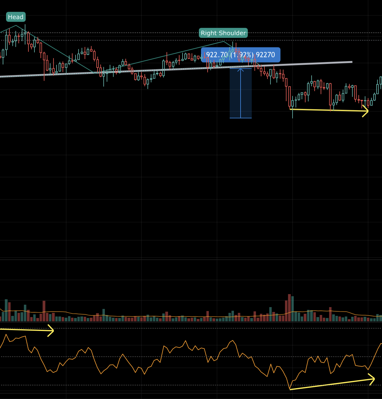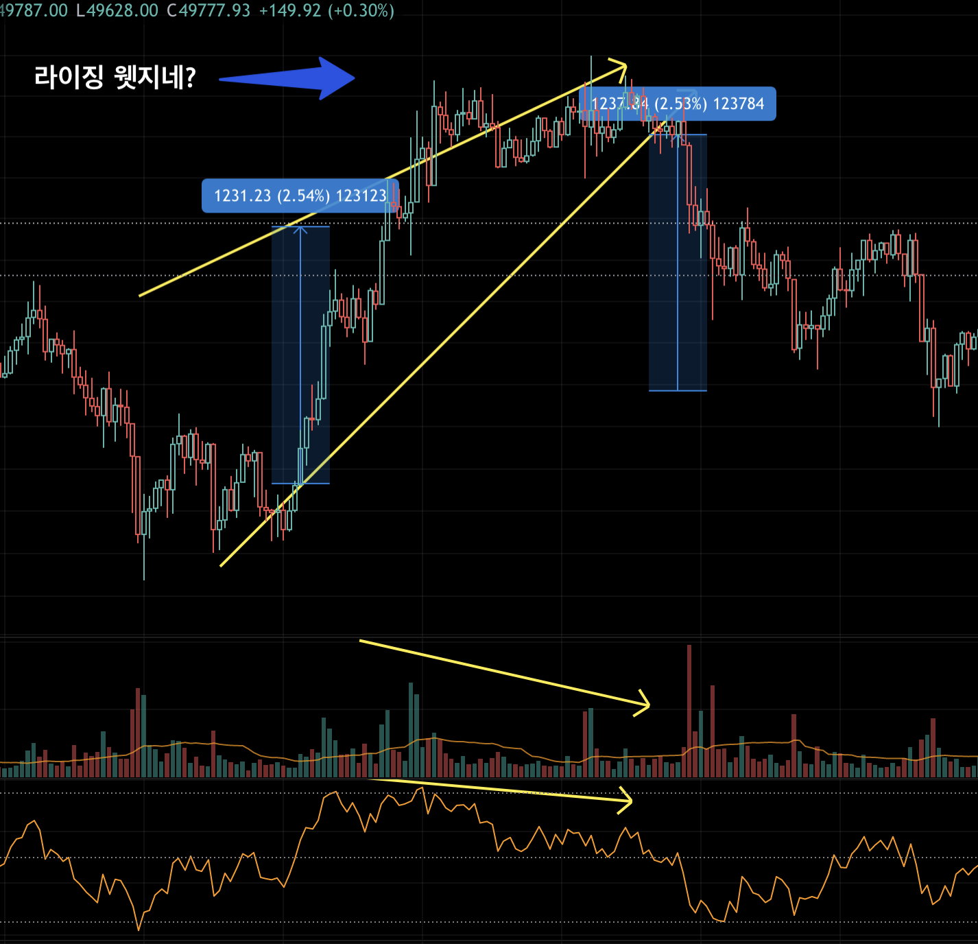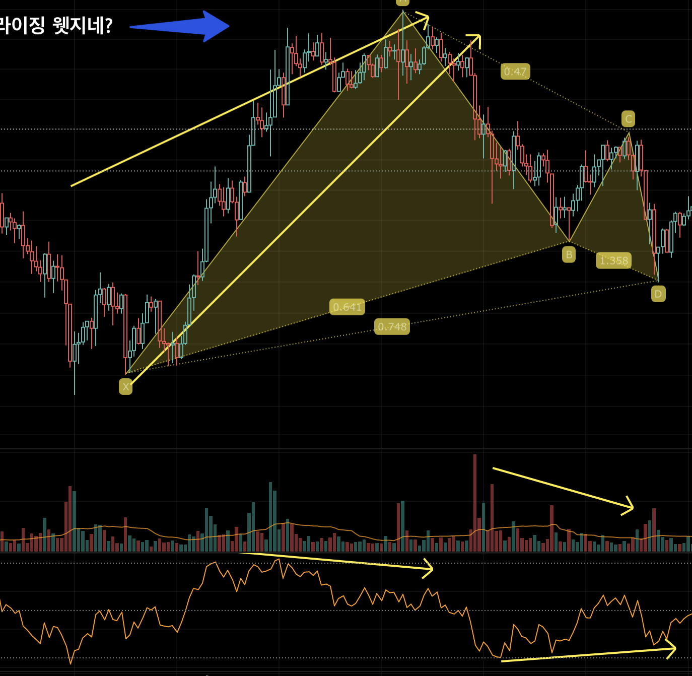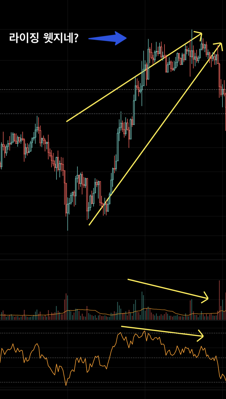 라이징 웻지 타겟 값 부근에서 rsi 다이버전스, 거래량 다이버전스 형성되고
