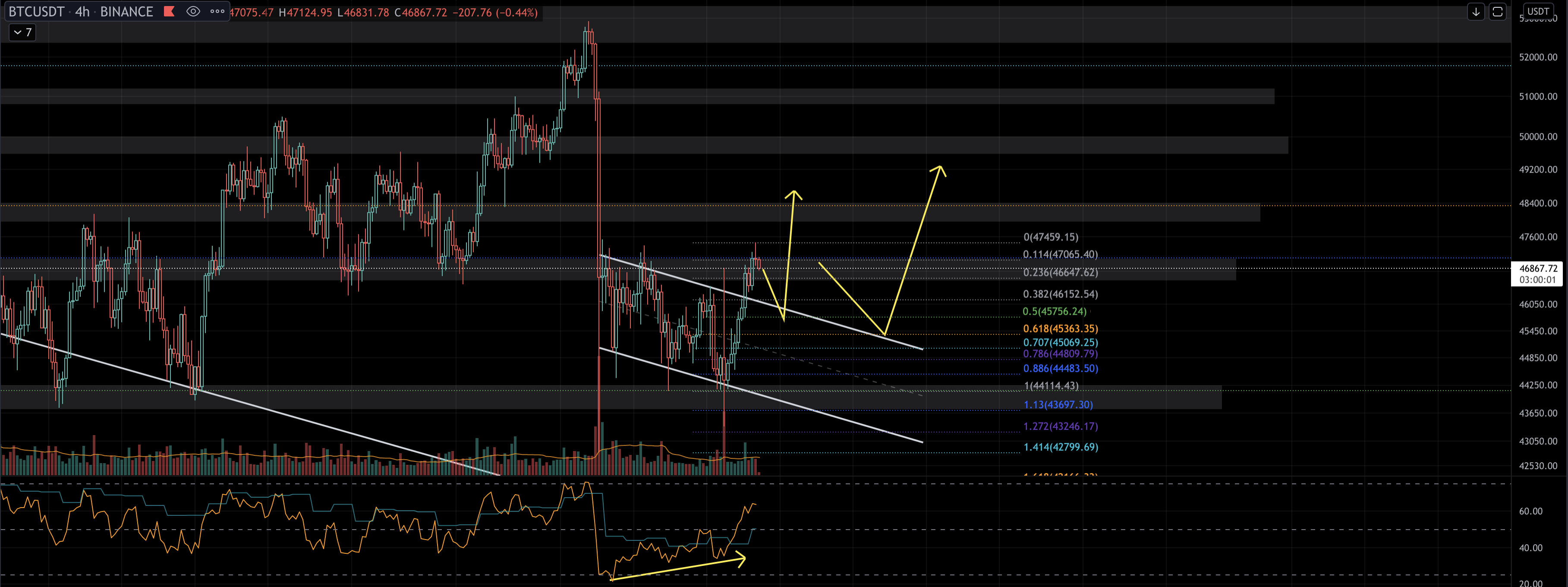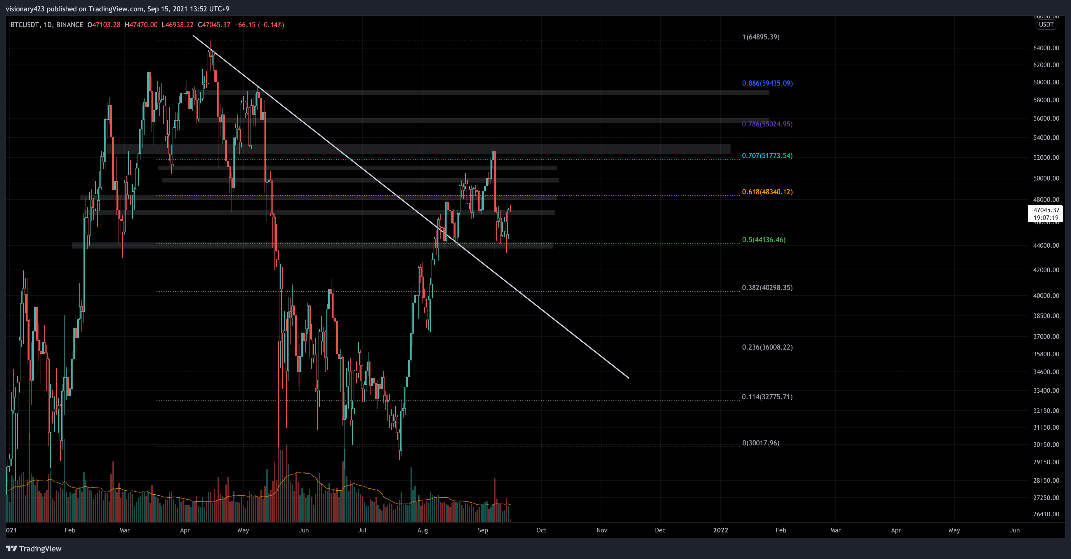 1차 타겟값은 바로 전 매물대 0.618, 2차는 49 후반