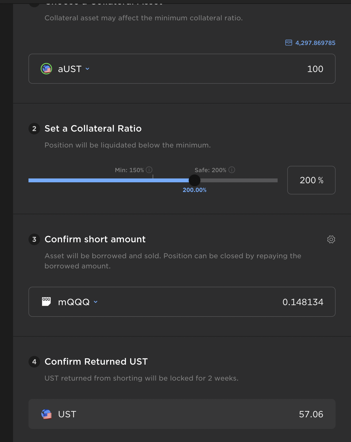미러 프로토콜은 특정 자산에 대해 숏 포지션을 열 때, 담보 비율을 보통 200% 로 설정함