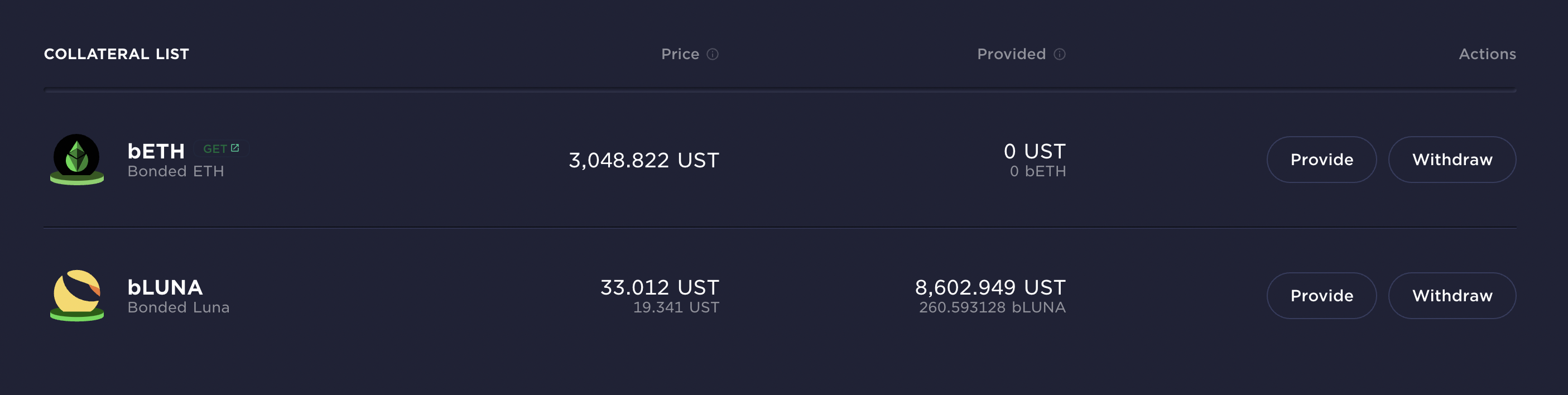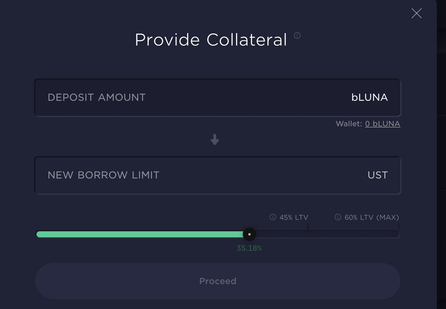 담보물에서 bLUNA - Provide 해주면 현재 루나의 가치 일정 비율만큼 UST (달러)로 대출을 받을 수 있음