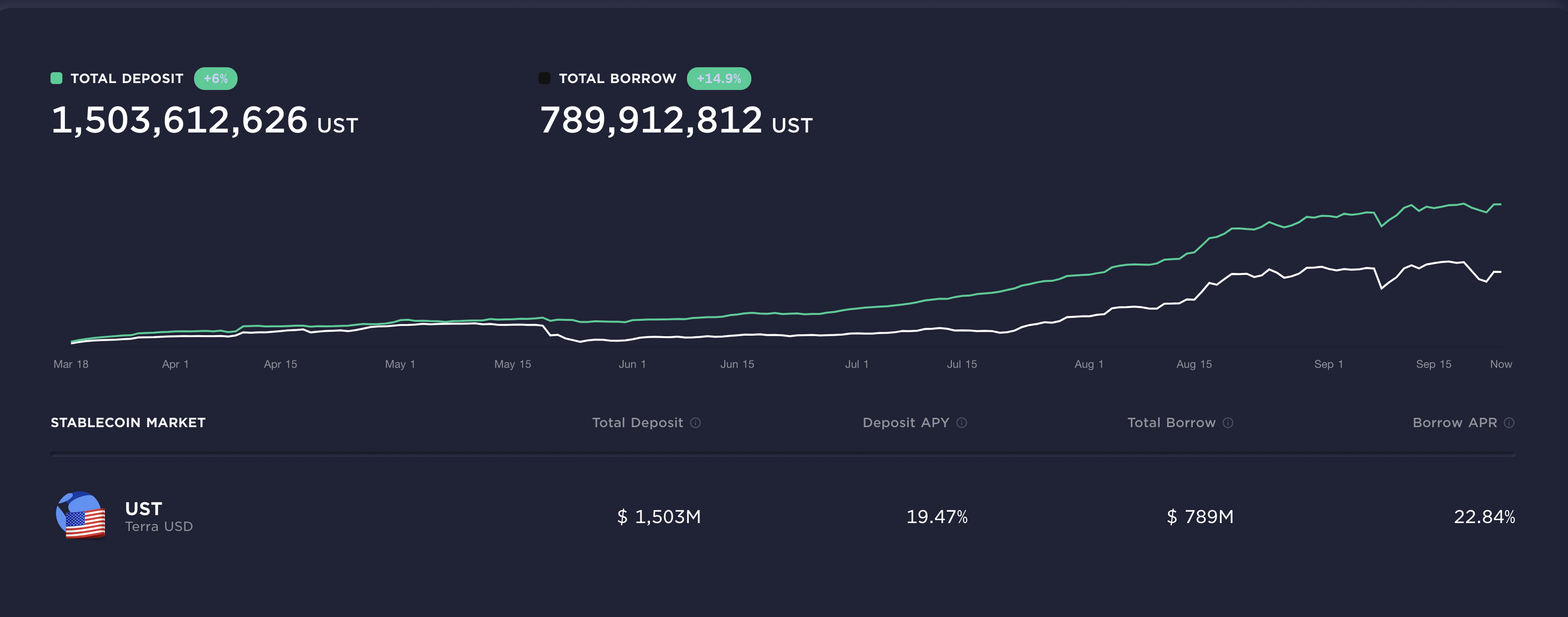 1. 대출로 받은 UST 달러를 앵커 디파이 (은행)에 예치를 해서 연이자율 20% (거의 고정 18~20%)를 받을 수 있다