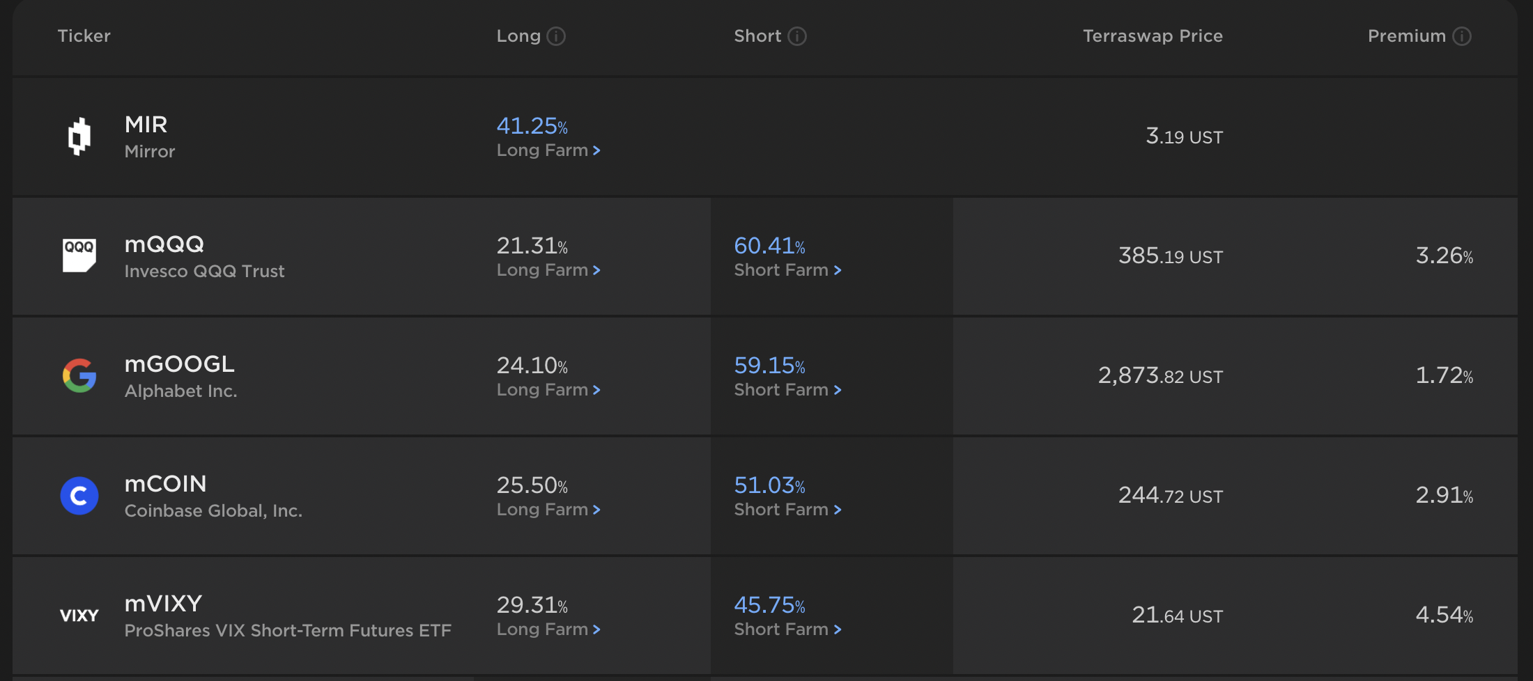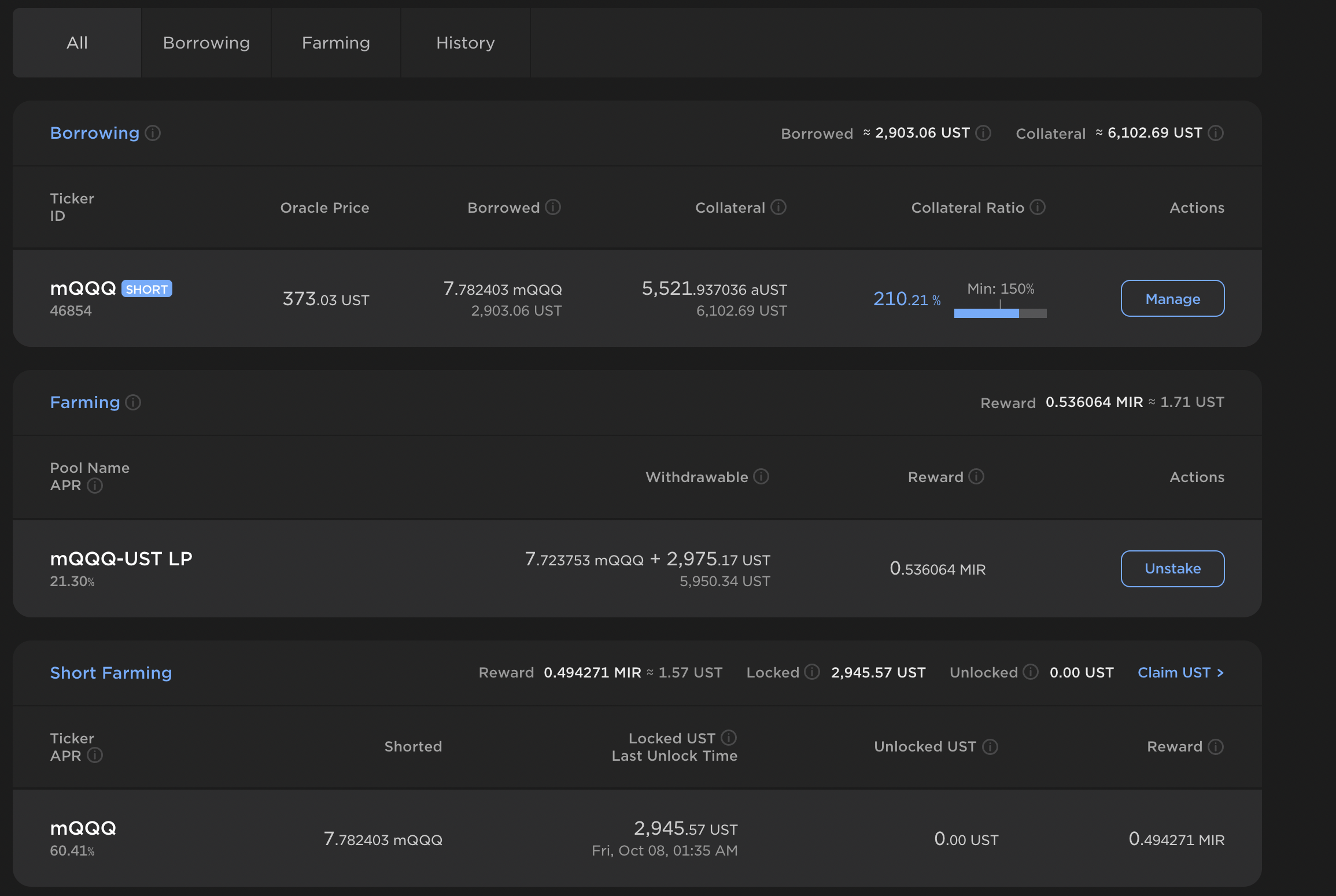 아무튼 이 aUST로 합성 자산을 다루는 미러 프로토콜에서 다른 자산을 빌릴 수 있고 (공매수, 공매도)