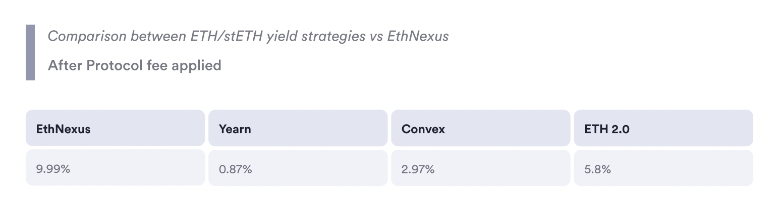 EthNexus의 ETH 이자는 다른 네이티브 ETH 디파이보다 더 높은 이율을 제공할 것이지만, bETH의 홀더보다는 낮은 이자를 제공함