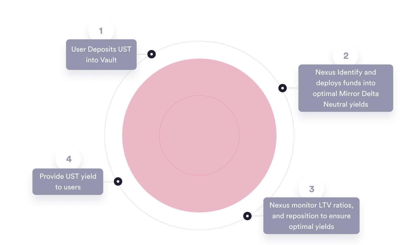 넥서스는 미러 프로토콜을 이용해 합성 자산의 자동화된 델타 중립 전략 (automated delta-neutral strategy)을 제공함