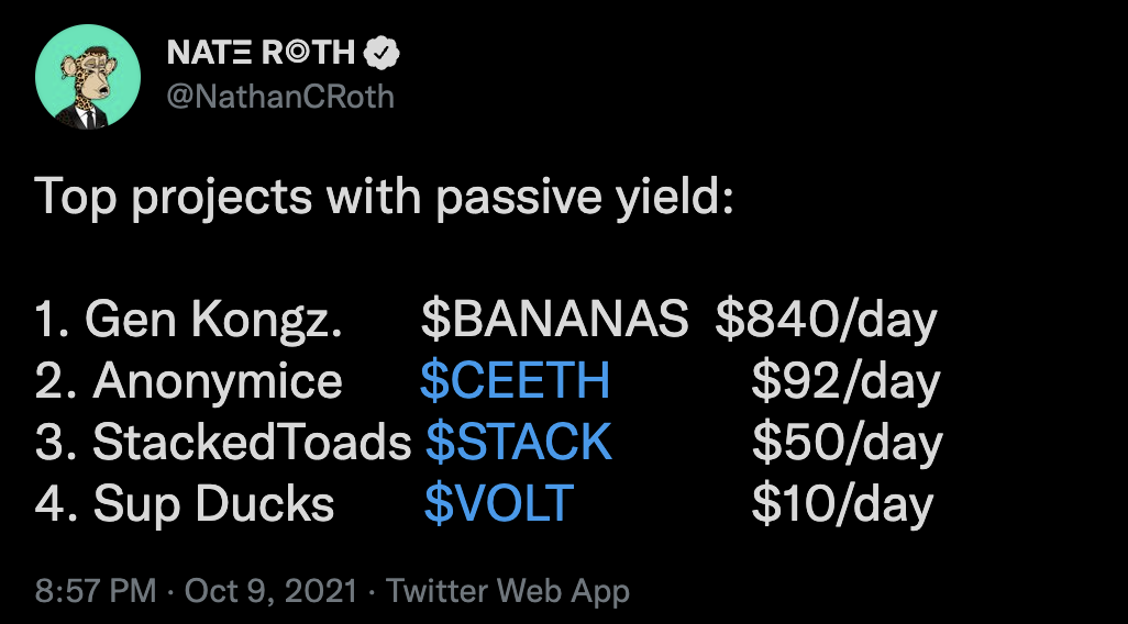 그러니까 NFT를 보유하는 것만으로 패시브 인컴을 창출하는 게 가능하다는 말!