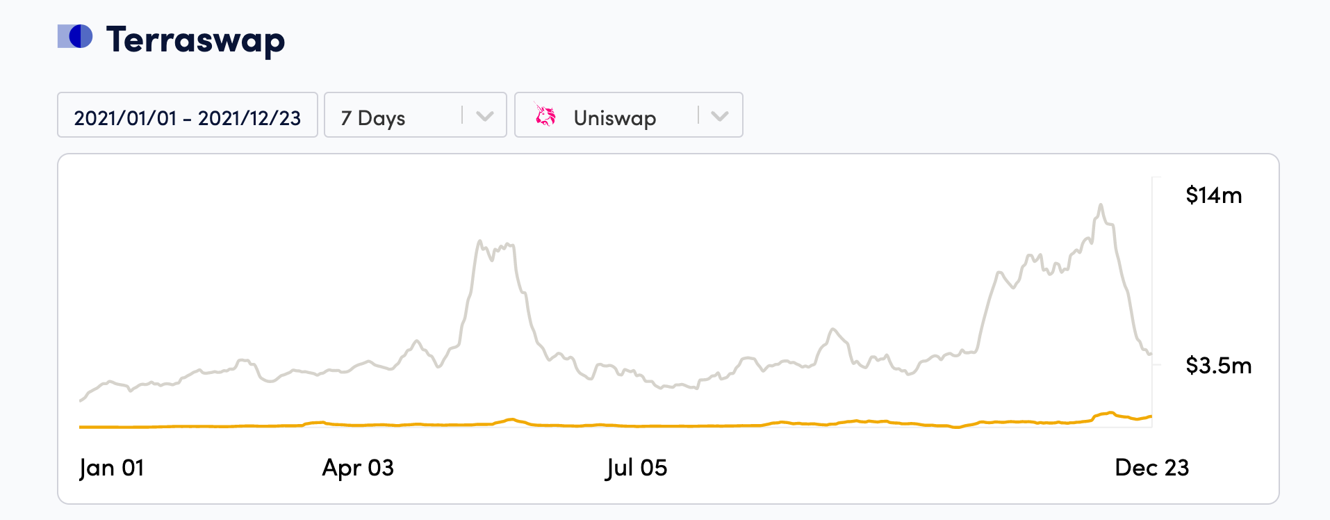 유니 스왑은 테라와는 비교도 안 되는 거래량이 나오는 덱스라서 비교가 좀 힘들것 같고