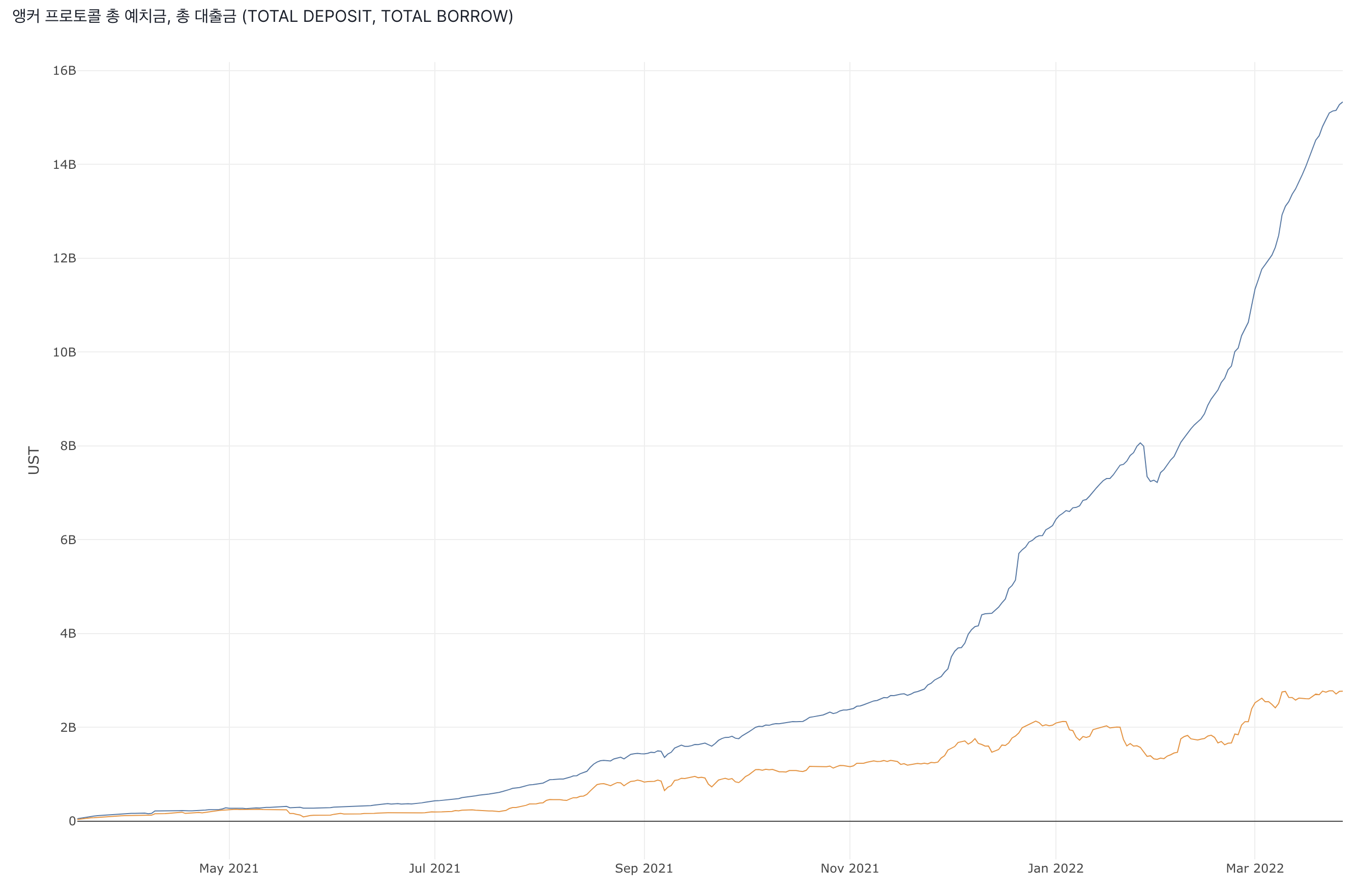 - 이는 앵커 프로토콜의 Deposit (UST 예치)가 Borrow 대비 폭발적으로 증가하였기 때문임.