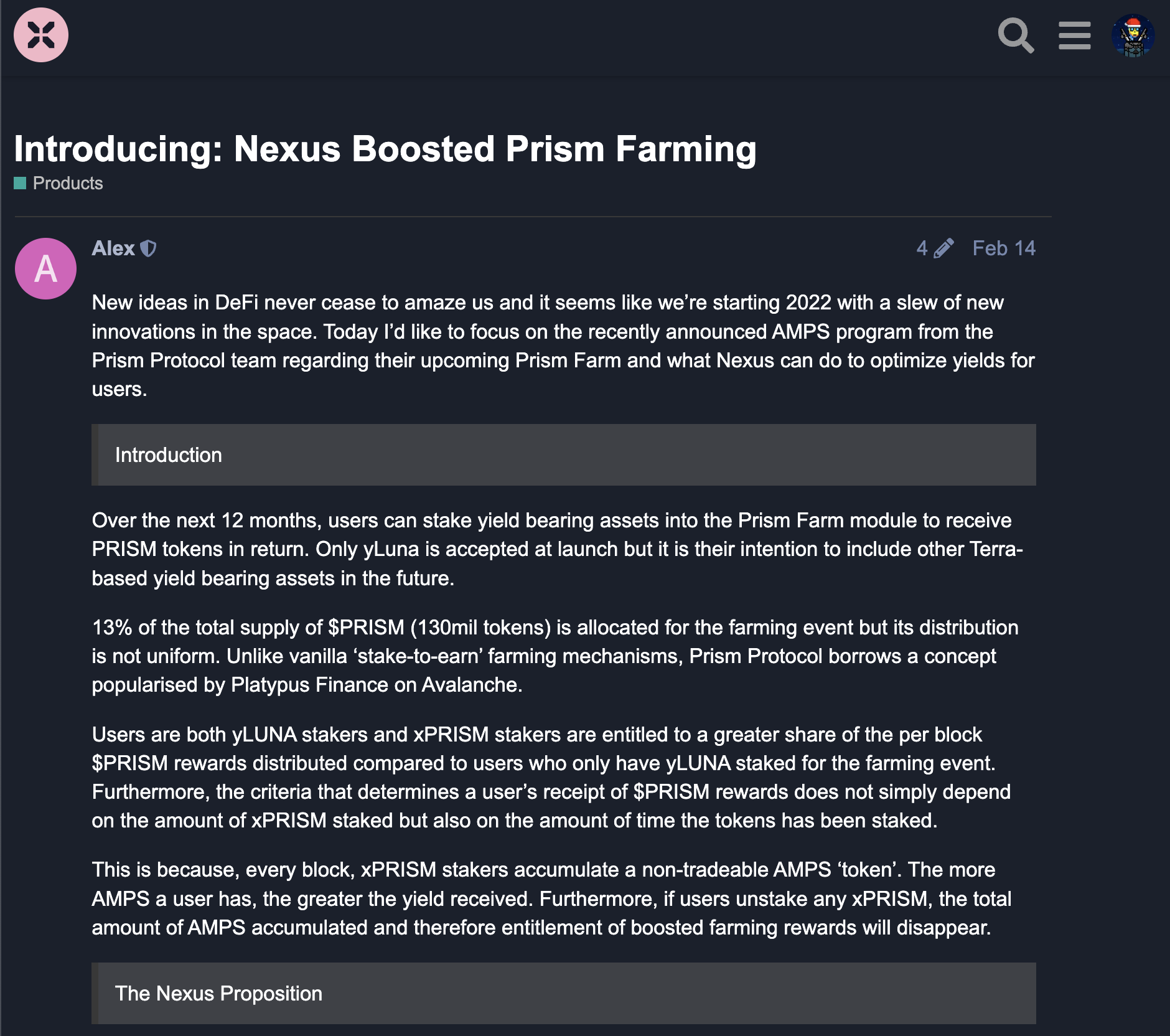 이를 완화해줄 수 있는 게 프리즘 AMP를 대신 모아주는 Convex와 같은 프로젝트의 등장일 것입니다. 프로토콜이 대신 xPRISM을 받아서 AMP를 모아주니, 이후에 신규 진입하는 사람들도 기존 사람들과 동일한 AMP 포인트를 행사할 수 있게 됩니다. 이건 Nexus 가 nxPRISM으로 준비를 하고 있네요.