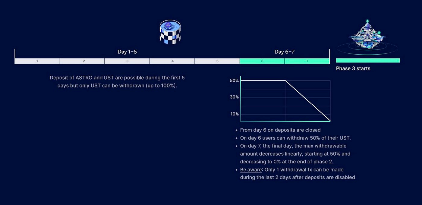 타임라인을 바탕으로 살펴보면 2단계의 첫 5일간 사용자는 스스로 넣고 싶은 만큼 ASTRO와 UST를 풀에 예치할 수 있습니다. 그러나 오로지 UST만 출금이 가능합니다. 이는 사용자로 하여금 그들이 기꺼이 기여할 수 있는 토큰의 최대 양을 입찰하도록 장려합니다. 마지막 2일간은 사용자는 UST 출금만 할 수 있습니다. UST가 풀에서 줄어듦에 따라 잠정적인 ASTRO의 가격은 내려가게 됩니다. 이는 사용자로 하여금 ASTRO:UST 비율을 통한 잠정적인 ASTRO의 시장가격이 사용자에게 만족스러울 때까지 UST를 출금하게 하여 적정 가격 산정이 이루어 지도록 합니다.