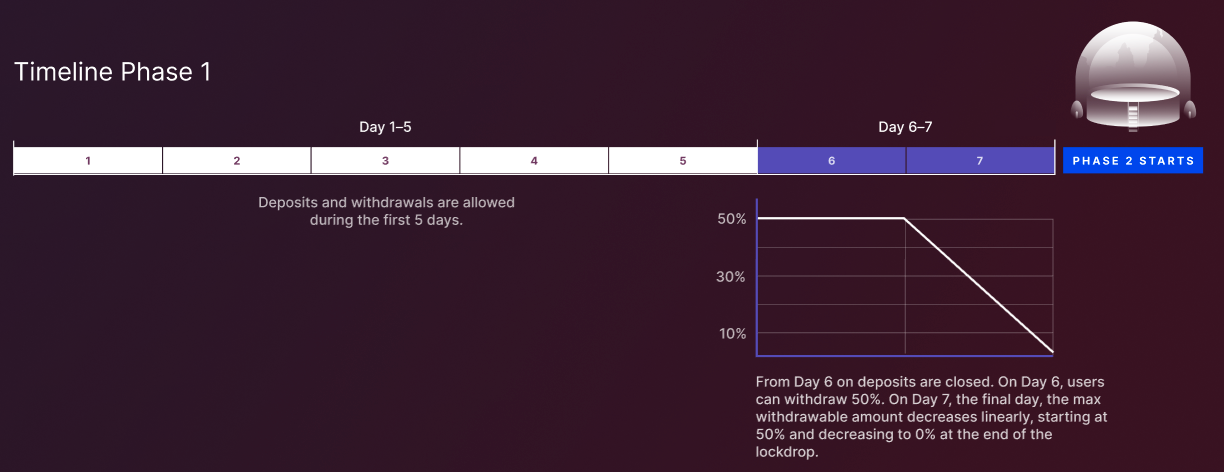 타임라인을 바탕으로 살펴보면 처음 5일간 동안 사용자의 예치와 인출이 자유롭게 하여 누구나 프로토콜에 들어와 자신이 투입할 수 있는 최대한의 유동성을 프로토콜에 기여하도록 유인합니다. 이후 2일동안 사용자는 공급한 유동성에 대해 인출만 할 수 있으며, 만약 자신이 락드롭에서 받게 되는 토큰(ASTRO)이 해당 유동성 공급의 기회비용보다 작다고 느낄 경우 이를 일부 인출할 수 있습니다.