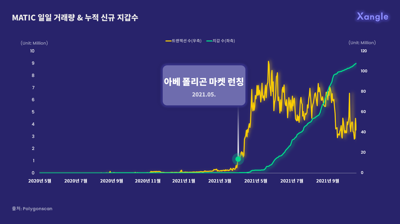 2021년 4월 디파이 렌딩 시장 점유율 1등 아베(AAVE)의 폴리곤 마켓 런칭 스시스왑, 아베고치, 유니스왑 등 주요 디앱들이 레이어2 솔루션으로 폴리곤 네트워크를 선택하면서 2021년 5월을 기점으로 트랜잭션이 수, 지갑 수, 토큰 가격 모두 떡상