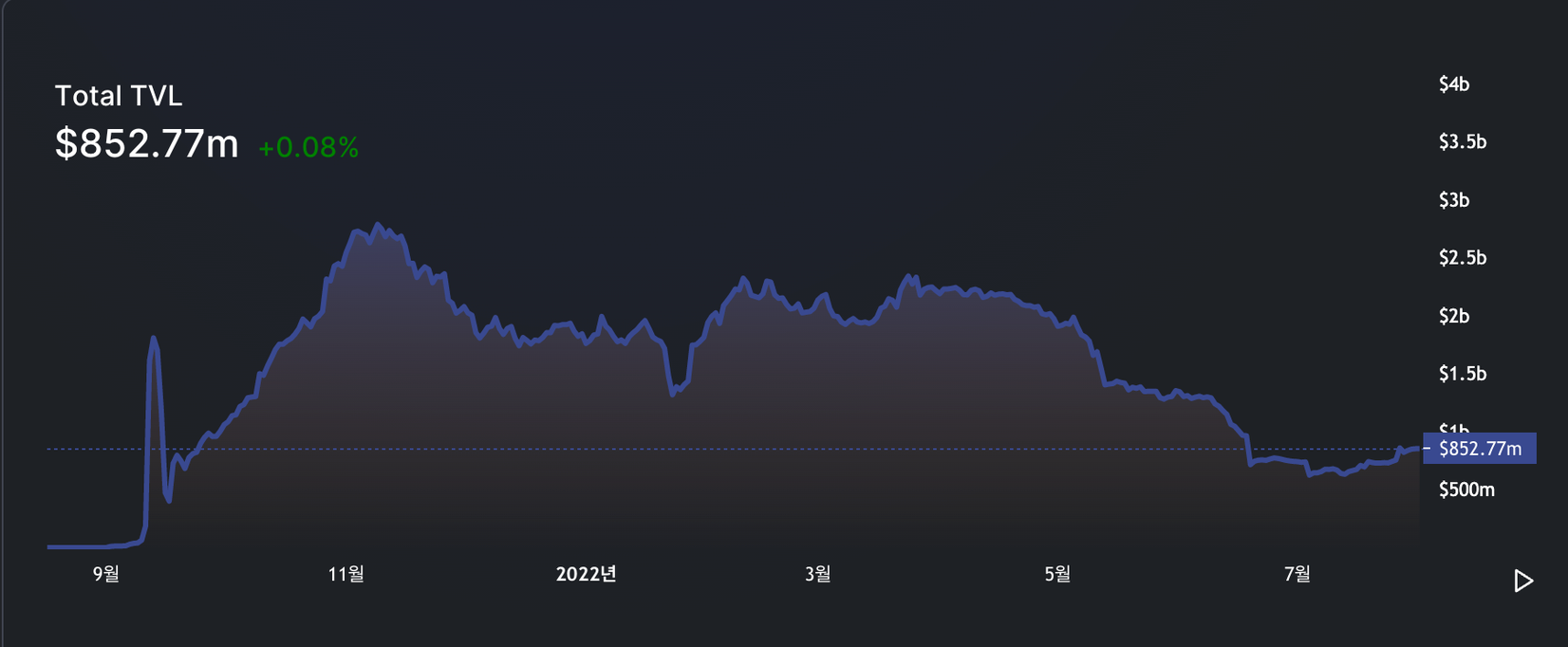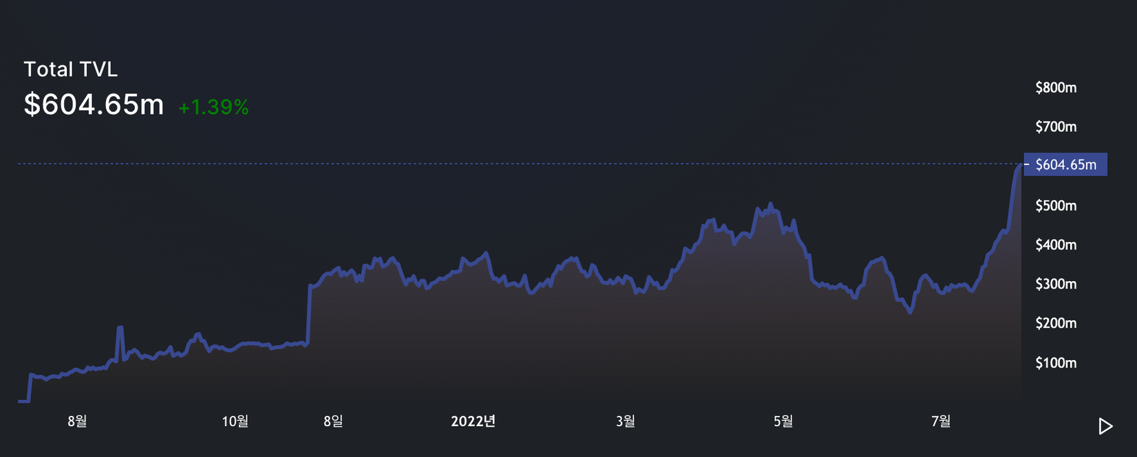 최근 테라 사태, 3AC, 셀시우스 등의 사태에 추가로 전체 자산시장의 약세로 인하여 TVL이$2.5B으로 하락했으나 아직까지 레이어2의 점유율 51%로 1등 유지중