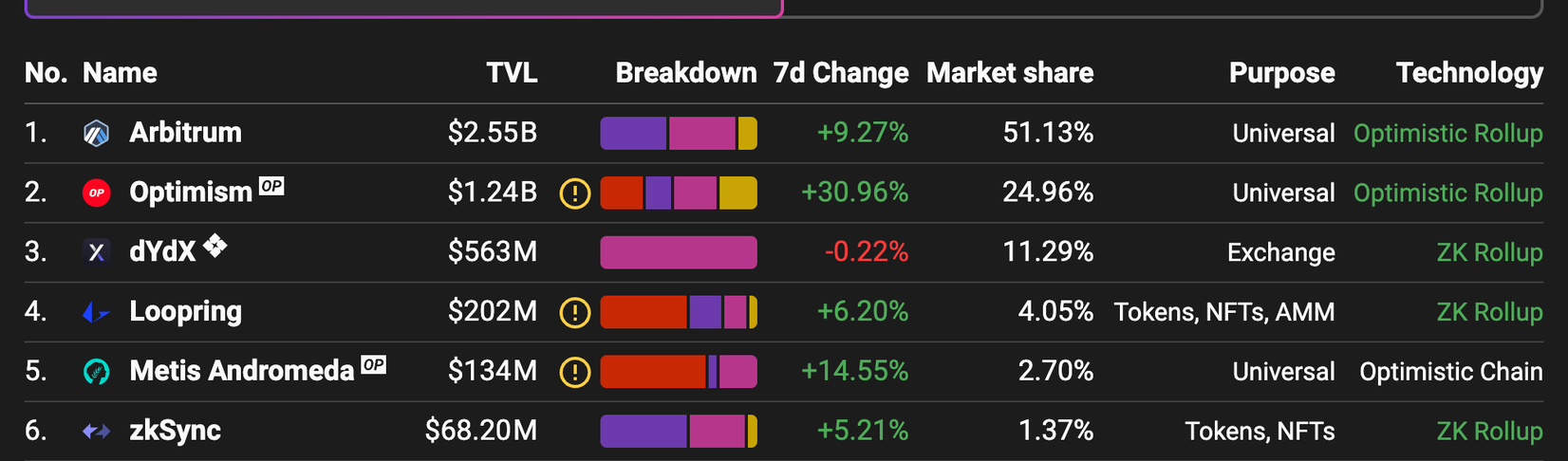 아비트럼은 레이어2 시장점유율 51% 로 1등, 점유율 2위인 옵티미즘(Optimism)의 시장점유율은 25%로 아비트럼과 약 2배 차이