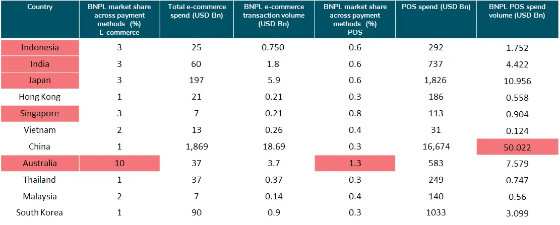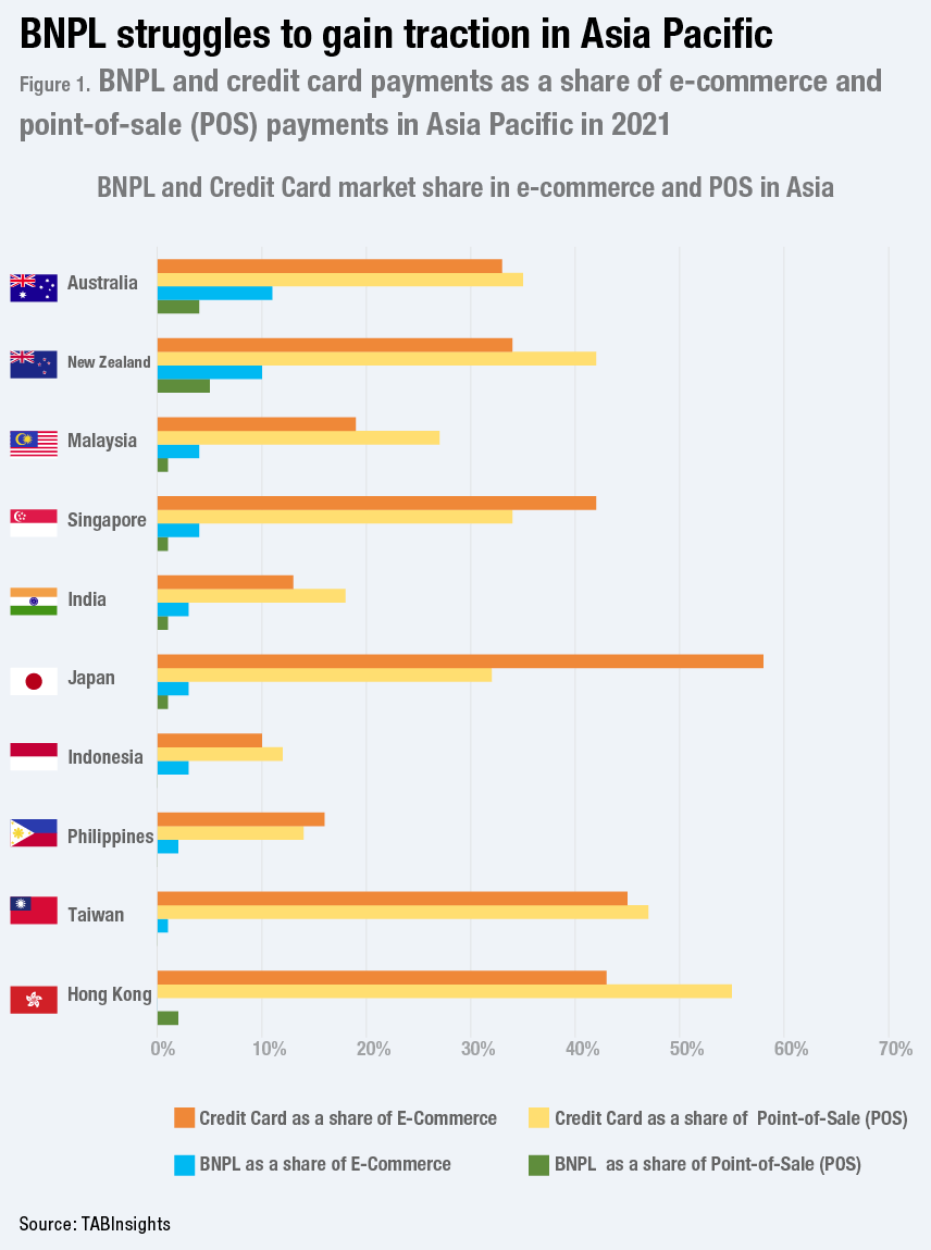 - In 2021, BNPL made up 2% of share in point-of-sale (POS) in Hong Kong, compared to 55% for credit cards. India has 1% of BNPL usage against 18% for credit cards. In Indonesia, BNPL made up 3% of payment methods used in e-commerce, compared to 10% for credit cards. Malaysia has a 4% BNPL share in e-commerce against 42% for credit cards. The Philippines is at 2% against 16% for credit cards. BNPL represented 4% of Singapore e-commerce payment volume, compared to 42% for credit cards.