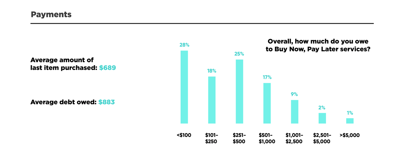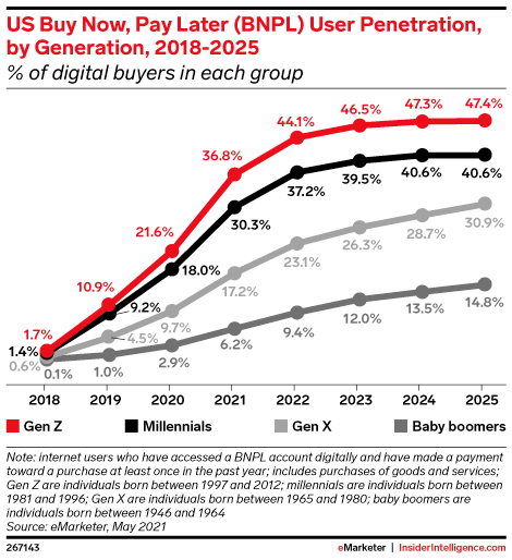 - 수수료 면제 및 별도의 신용평가 절차 없이 이용 가능한 BNPL 서비스 특성상, 소비 욕구는 높지만 신용도가 상대적으로 낮은 연령대의 접근이 용이하기 때문에 Z 세대 및 밀레니얼 세대에게 큰 인기를 끌고 있음