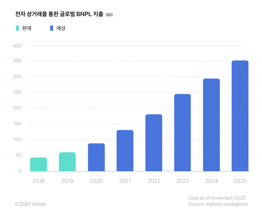 - 금융시장 분석기관인 S&P Global에 따르면, BNPL 시장규모는 2020년 890억 달러에서 2025년까지 3,500억 달러로 5년간 약 400% 성장할 것으로 전망하였음
