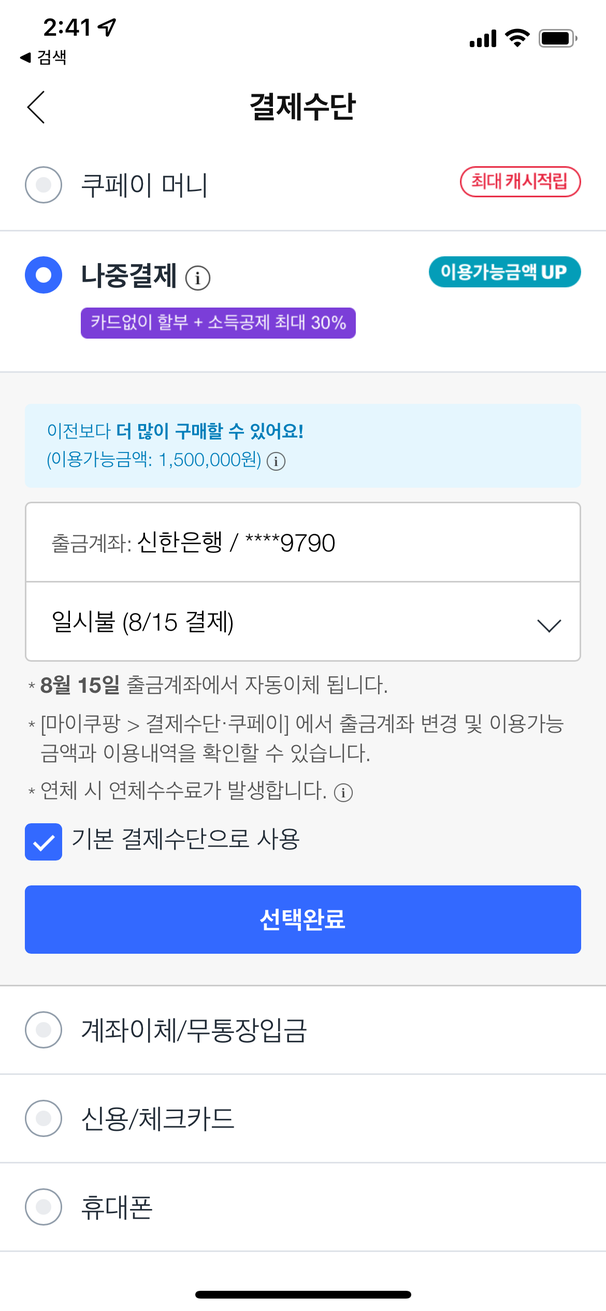 - 연회비는 물론 분할납부 수수료나 이자도 없음. 연체할 경우 연체 수수료를 내지만, 신용카드보다 저렴한 편