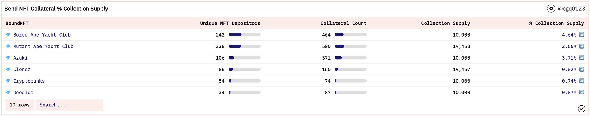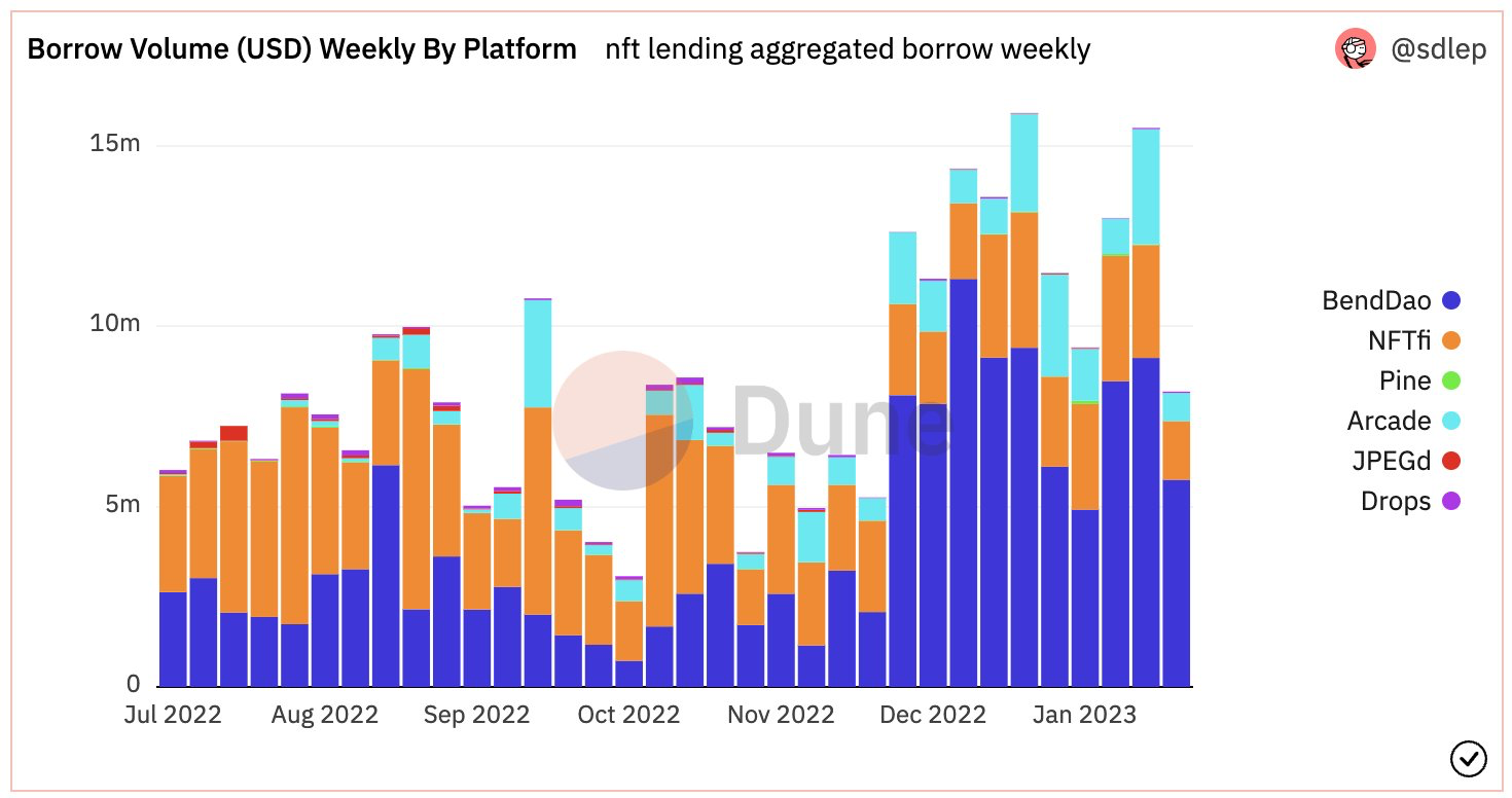 - 그리고 또 최근에 NFT 담보 대출 플랫폼 BendDAO와 같은 NFT-fi 프로토콜의 최근 대출 규모가 ATH 갱신하였음. 차입 수요는 BAYC, MAYC, AZUKI와 같은 소수의 블루칩 NFT에 집중되어 있는데 BAYC는 4.6%가 담보 대출로 활용됐고, 이는 Blur기준 리스팅 매물과 동일하기에, 이들이 청산 매물로 시장에 나오면 거래소 매물은 2배가 됨.